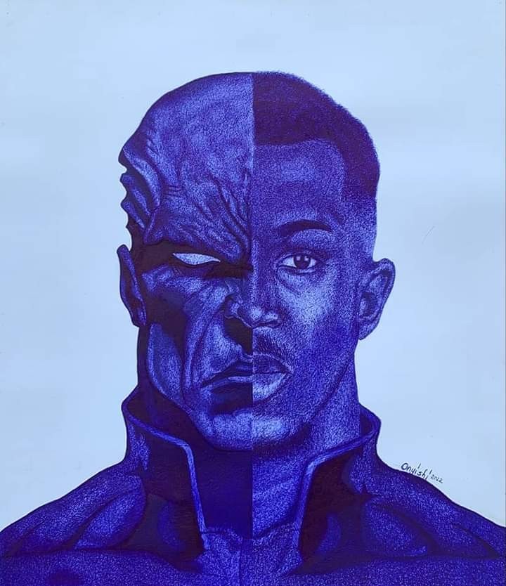 Half man, half alien. Made with ballpoint pen on paper. 12" × 16" Can recreate bespoke pieces for any gender.